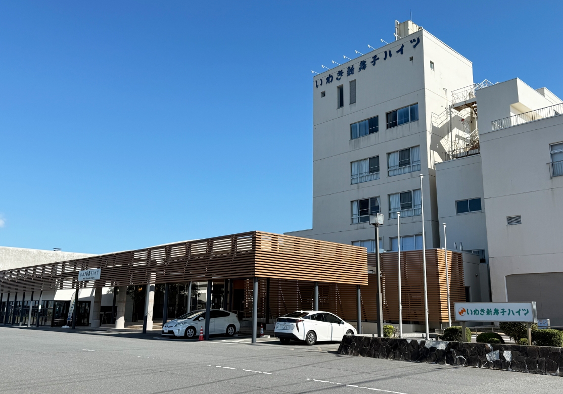 いわき新舞子ハイツは、太平洋を一望できる人気の温泉旅館で、いわきの中心街から10kmほどの海沿いにある。