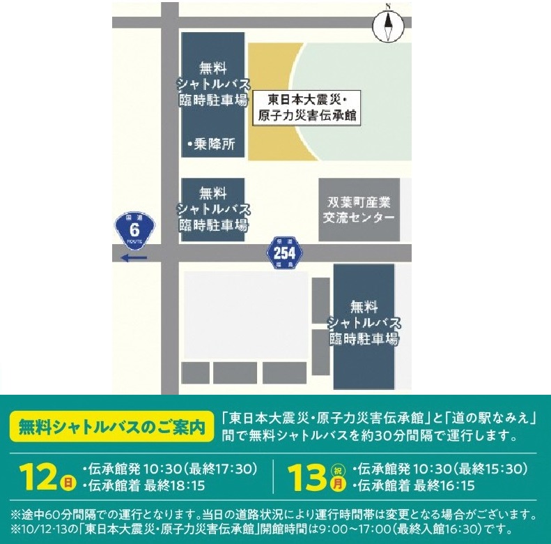 東日本大震災・原子力災害伝承館(双葉町)周辺の臨時駐車場をご利用の上、無料のシャ